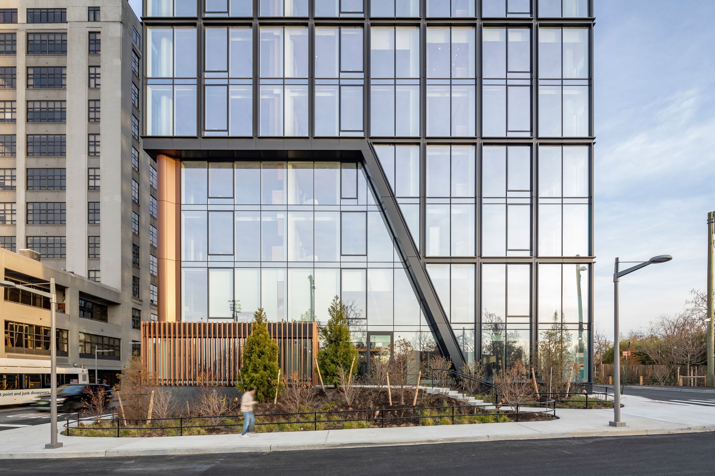 The two languages on the façades of this affordable housing complex represent the industrial past by the use of Brooklyn's characteristic materials, and the residential present through the insertion of outdoor spaces to the overall volume. The juxtaposition of traditional materials and residential volumes signifies the historical transition of this Brooklyn area.